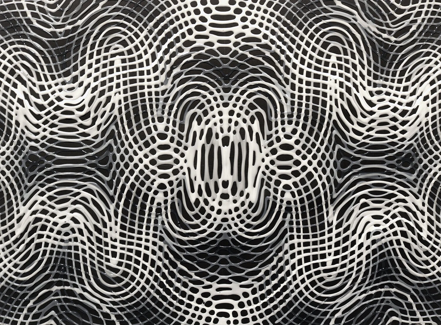 Rounding out my interior monologue (well, not so interior anymore), I am looking at yet another series, one presenting radically different challenges to the structural autonomy of their central forms, now often enmeshed in noisier, more chaotic compositions. What I observe is a different kind of pandemonium, a visual field strewn with random juxtapositions of ill-defined entities and movements. But at the same time, consistent with the previous series, the compositions stay anchored around a prominent central figure. More crucially these figures are no longer paragons of geometrical, human-made precision. Rather these sinuous shapes allude to something more akin to Bataille’s l’informe. Briefly, his concept of l’informe, has been recruited for art criticism (e.g., Rosalind Krauss and Yves-Alain Bois, 1996) both as a nod to formlessness more generally and as a strategy to shun conventional, static, visual (or cultural) structure for a more propulsive, process-based aesthetic. Here the “process” part is less apparent, but other relevant descriptors are. Let me add, for example, feral, slithering, protean, all of which evoke something strangely alive and decidedly uncanny. This lifelike effect is further heightened by the application of white, curvy highlights that render these otherwise flat shapes into bulbous, virtual volumes.